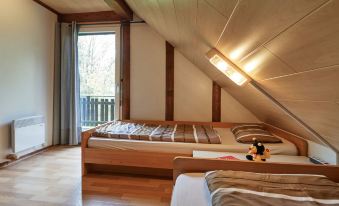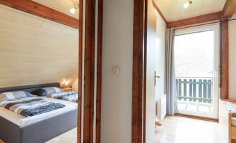 Holiday village "Frankenau", surrounded by trees and meadows. Outside the resort, 2 km from the centre of Frankenau, in the district Nationalpark Kellerwald, on a slope, 28 km from the lake. For shared use: natural state property, pond. In the complex: restaurant with TV, kiosk, sun terrace. Bread roll service. Grocery 8 km, restaurant 2 km, bakery 2 km, bicycle rental 15 km, bus stop 400 m, railway station "Frankenberg" 15 km, outdoor swimming pool 6 km, indoor swimming pool 15 km, thermal baths "Bad Wildungen-Reinhardshausen" 20 km, bathing lake 12 km. Golf course (18 hole) 25 km, indoor tennis centre 400 m, gondola lift 27 km, fishing possibilities 700 m. Nearby attractions: KellerwaldUhr 500 m, Schloss Waldeck 27 km. Well-known ski regions can easily be reached: Winterberg 45 km, Willingen 50 km. Well-known lakes can easily be reached: Edersee - Herzhausen 13 km. Hiking paths: Nationalpark Kellerwald 500 m. Please note: suitable for families. Neighbourhood highly sensitive to noise. Quietness and good behaviour expected. Some of the holiday homes can be reached via steps. At the park entrance there is a bistro/café with a sun terrace, Sunday breakfast buffet, children's cinema, table football (limited opening times outside of the season). There is also the option of using a washing machine and dryer for a fee. "Sigi", 4-room house 75 m2 on 2 levels, on the ground floor. Modern and wooden furniture furnishings: living/dining room 25 m2 with cable TV (flat screen), hi-fi system, wood-burning stove and air conditioning. Exit to the terrace, to the patio. 1 room 12 m2 with 1 double bed (180 cm, length 200 cm), hand-basin and separate WC. Open kitchen 8 m2 (oven, dishwasher, 4 ceramic glass hob hotplates, kettle, microwave, electric coffee machine). Shower, sep. WC. Upper floor: (spiral staircase), 1 room 12 m2, with sloping ceilings with 1 double bed (180 cm, length 200 cm), hand-basin. Exit to the balcony. 1 room 11 m2, with sloping ceilings with 2 beds (90 cm, length 200 cm). Exit to the balcony. Electric heating. Small balcony 5 m2, south facing position, large terrace 20 m2 partly roofed, patio, lawn 100 m2. Terrace furniture, balcony furniture. View of the forest. Facilities: logs (extra). Internet (WiFi, free). Please note: non-smoking house. Smoke alarm, fire extinguisher. On the ground floor, the rooms are connected by stairs (mezzanine). Bookings accepted for holiday purposes only.