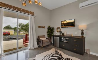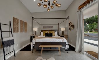 The open layout of the cottage features a king bed with luxury bedding, flat-screen television, and all the necessary amenities for a convenient stay, including a coffee pot, microwave, and mini fridge. The bathroom features an exquisitely tiled spacious walk-in shower with a built-in shower bench. Located minutes from the heart of downtown Fredericksburg, this cottage is the perfect escape for those looking for comfort, convenience, and relaxation.