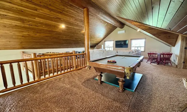This 4300 sq/ft cabin has 7 bedrooms, 4 baths, and plenty of open space to comfortably sleep 18 guests in beds. The lodge also includes a covered hot tub, pool table, foosball table, wireless internet, and a fire pit. The over sized wrap around deck is perfect for outdoor eating and soaking in the breathtaking views in every direction. As an added bonus, there are 2 sets of washers & dryers, 2 fridge/freezers, and 2 water heaters!