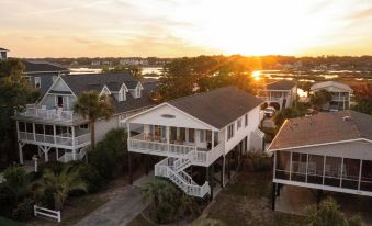 This house is perfect for 2 families to share, sleeps 8. When you step inside off the large rocking chair front porch, a gorgeous open concept living, dining and kitchen area greets you. Decorated with calming sand colored walls, white and wood accents this home feels like an extension of the beach. Palm fronds, surf photography and a well outfitted kitchen will make you feel immersed and prepared for vacation. The master bedroom is a spa like oasis, with a private makeup vanity to provide everyone with their own space while getting ready for a dinner out at the Marsh Walk or day on the beach. The master steps out onto a large elevated deck with a huge shady Live Oak to protect you from the evening sun. The sunset views over the Murrells Inlet Marsh are stunning. The second bedroom also has a queen bed and large double closets. The third bedroom shares two sets of bunk beds, so you can pile all the kids into one room for vacation while the adults have their own spaces. Since the house is elevated, there is an additional 1,500 sq ft of living space underneath complete with a large outdoor shower/changing room, a dry bar, a bench swing, life size Jenga, parking, a guest beach storage closet and a nice yard to play in.
