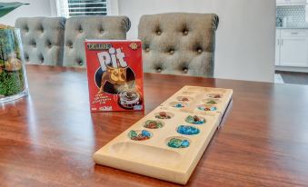 modern family/pet friendly 3 bedroom bungalow sleeps 8 with amazing master suite w fully stocked kitchen. large yard w games for the family like corn hole, ladder toss, bocce and spike ball. Front porch daybed swing.About pets:Pets allowed: dogs less than 50 lbs per pet (limit 2 pets total).About checkOut:Check out before 11:00 AM.About children:Children allowed: ages 0-17.Pack N' play, highchair.About checkIn:Check in after 3:00 PM.About smoking:Smoking is not permitted.About minBookingAge:Minimum age to rent: 21.About events:No events allowed.