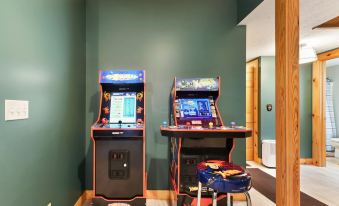 One of the highlights of this cabin is its entertainment options. A dedicated game room features a 12 foot shuffleboard table along with two stand up arcade games, providing hours of fun for guests of all ages. Additionally, a gaming table is the perfect spot for checkers, chess, or board games with the family.