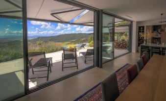 On the terrace by the kitchen is a pergola providing shade for the outdoor dining table. Electric awnings extend to provide shade over the terrace as required.