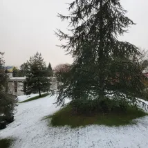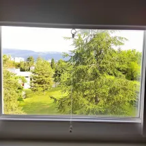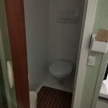 방은 꽤 좋고, 이층 침대가 있어서 3명이 잘 수 있습니다. 욕실은 건식과 습식으로 분리되어 있으며 세면대는 외부에 있습니다. 아침에 일어나 창문을 열었더니 창밖 풍경이 너무 아름다웠고, 푸른 나무들과 초원들이 있었고, 멀리 알프스가 보였습니다!