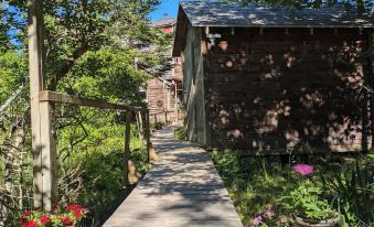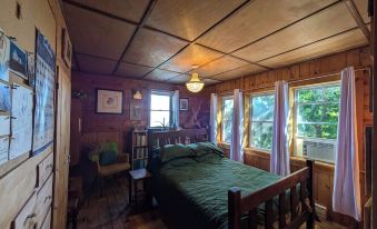 Matching the unique exterior architecture—with its rustic turret and tower, is eclectic interior design. The house was lovingly built by the owner over the course of 50 years. Bedrooms are named for the Hall family history: the Reverend’s Library, the Botanist’s Retreat, and the Lookout Loft. The house sleeps six comfortably, each room with a double bed. There is plenty of space in first floor living area for air mattress/extra guests if desired (no charge for additional people).