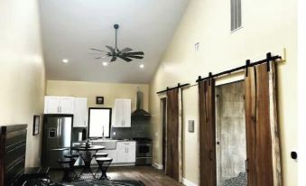 This is a studio home with a bedroom area, well equipped kitchen, pantry and closet area, a sitting area with TV and electric fireplace. There is a spa and outdoor shower that is shared with the owners of the home. They are next to the main house but there is a privacy fence up. We will respect your privacy, all you have to do is ask, a BBQ will be available for your use as well at your cottage.