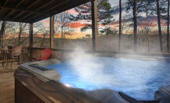 Expansive covered porches, BBQ grill, firepit, hot tub, and outdoor furnishings. Walk down to the river for breathtaking views. You will not be able to walk directly into the river from the bottom of the stairs. It is just for getting a better view of the river.
