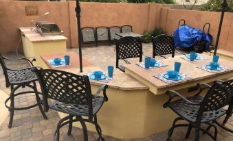 ****The “resort style” backyard is the real gem of the home offering a beautiful large pebbletec pool and a built-in BBQ island with seating & patio umbrellas with LED lights for the evenings on the patio. Adjacent to the BBQ area is a large fire pit with bench seating and a couple of Adirondack chairs to enjoy the fire. The covered patio area has a 43” Samsung TV installed so you can have a meal outdoors without missing the game or movie night. The backyard lighting provides a gorgeous place to spend the evening with your family and friends....making memories and making the most out of your Arizona vacation experience.