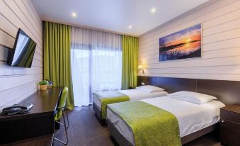 Были впервые в Карелии и остановились в этом отеле с 24.04 по 29.04. Отель очень понравился, расположен на лесной опушке с озером. Отель небольшой, состоит из трёх двухэтажных корпусов, все номера с видом на озеро и лес. У каждого корпуса парковка, въезд на территорию по пропускам. Номера небольшие, в эко-стиле, все номера с балконами. В номере чистота и порядок, в ванной чисто, есть косметические принадлежности и фен, полотенца меняют ежедневно. В номере наборы для чая, капсюльная кофе-машина, вода - все ежедневно пополняют в нужном вам количестве, также сейф, холодильник, тапочки. Не хватает халатов. На ресепшене можно взять поиграть настольные игры. Замечательная панорамная баня обязательна к посещению! Завтраки в кафе «точка на карте» в формате буфета хорошие, нам понравились. До кафе проложена дорожка по лесу, приятно прогуляться. Чего не хватает, так это тропы здоровья вокруг озера, руководству отеля необходимо об этом задуматься, природа располагает. Для тех, кто планирует посетить этот отель, нужно понимать, что это просто место ночёвки и отдыха после насыщенно поездками и экскурсиями дня. Отель не предполагает развлечений, ресторанов, дискотек, кальянов и анимации, он предполагает просто размещение. Рекомендую данный отель для отдыха и путешествий по Карелии.