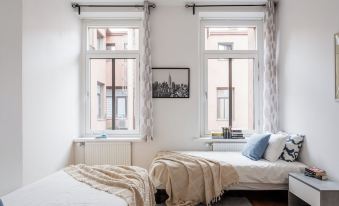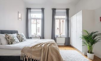 Spacious 2-bedroom apartment in central Gothenburg with 2 single beds and a king-sized bed. The fully equipped kitchen features an oven, stove, microwave, kettle, toaster, and large fridge. Enjoy free access to a washing machine and dryer. Located 200 meters from Kungsparken and Handelshogskolan train station, 300 meters from the main river, and 1 km from Gothenburg Central Station. Over 50 restaurants and 3 supermarkets within a 5-minute walk. Brand new linens, TV, and books provided.