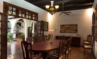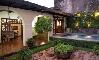 All rooms are fully equipped with beautiful antique furniture. The living areas are organized around extensive corridors fully furnished with antique furniture, library, dissected African buffalo head, antelope heads and elephant ivory tusks on the wall. There is a private familiar bar and seating area next to the pool. The opposite end of the pool is located next to a waterfall volcano rocks wall from Masaya volcano. The home has three classical colonial living rooms with doors directly to La Merced Church´s atrium and view to Calle Real where you get a cool breeze coming from the East (Nicaraguan Lake).