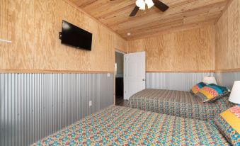 The Lodge contains 3 private bedrooms (two bedrooms, each with a queen bed and one room with 2 full beds), as well as 2 sofa pull-out couches that can each sleep 2 and single roll-away bed. The Lodge can comfortably sleep 13, with 2 full bathrooms and onsite washer and dryer. Along with a large open living room and kitchen, and with stocked Coffee/Tea area. The large customize built kitchen island is the focal point of the Lodge and provides a great space for conversation over meals you can prepare on site. You may also choose to soak in our 5 person jet hot tub, open all year around.