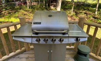 It’s a beautiful house in a beautiful setting! All the things you need in a kitchen (dish washer, Keurig, plenty of towels, stove, oven, microwave). Also has an outdoor grill and firepit. Also a popcorn machine!