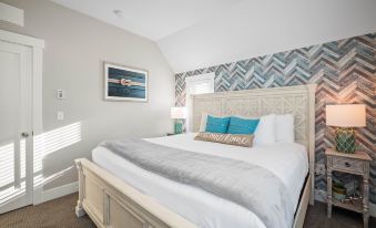 Located on the 2nd floor, the master bedroom has a king size mattress, hotel style bedding, dresser, closet, and 30” Roku Smart TV.
