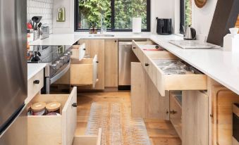 • The kitchen is stocked with high-end kitchen appliances, cookware, silverware, servingware, spices, coffee & tea