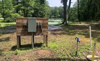 So thick with moss and other vegetation it was hard to fish. The ground in front of cabin and around fire pit was very rutted and seemed to have been a driveway to a gate at one time. Grass in this area could have used a trim. With grass and lake situation the bugs were to abundant to enjoy the outside in the evening. A train track sit very close to cabin with a road crossing fairly close, a night time train arrival is startling when the train whistleblows. The cabin is adorably charming! Cabin was fairly clean. Fridge could have used a good cleaning vs. a wipe down, bathroom floor needed swept and a night light. Bed was very comfortable, sheets, comforters, blankets, towels were clean. A toaster would be nice but other kitchen appliances were adequate as was necessary cleaning supplies. Cabin was without power for 4+ hours due to storm, flashlight or 2 would be nice for the just in case. Jake was very friendly and attentive to our needs, even apologetic for the power outage. Check-in/out was simple!