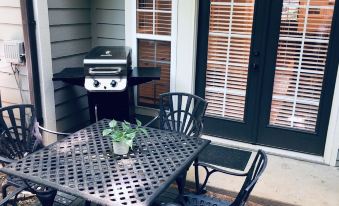 Nice, well-stocked condo in a great location. Quiet neighbors. There are the occasional fireworks and train whistle as it’s close to the ball field and tracks. Kitchen has everything we needed. The back has a table and chairs but note in the warm months the AC compressors run. We will stay here again!