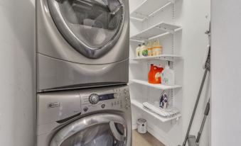 The fully stocked kitchen is a chef's delight, equipped with modern appliances, cookware, and utensils. Prepare delicious meals and dine at the stylish breakfast bar or gather around the dining table for a more formal setting. A complimentary washer and dryer are located just off the kitchen for convenience.