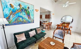 The living room features plush seating arrangements, adorned with throw pillows and textured rugs, creating a cozy yet stylish ambiance. A flat-screen TV with streaming services awaits for your entertainment needs, but who needs TV when you have panoramic views of the Caribbean sunsets right outside?