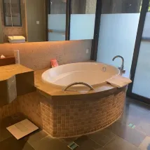 제 경험을 간략하게 공유해 드릴게요. 처음에는 호텔이 괜찮아 보였고 직원들도 꽤 친절했어요. 하지만 방 문을 여는 순간 깜짝 놀랐어요. 문을 열자마자 퀴퀴한 냄새가 코를 찔렀거든요. 방은 어두컴컴했고, 1.2미터짜리 침대 두 개는 너무 낮았어요. 담요는 완전히 축축했어요! 방은 엄청나게 습했는데, 이런 환경과 침구 때문에 저는 심각한 피부 알레르기가 생겼어요! (첨부된 사진 1 참조) 게다가 호텔 워터파크 시설도 너무 더러웠어요! 아이는 물에서 끔찍한 냄새가 난다고 했어요!