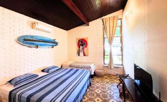 Ficamos no quarto privativo. É simples porém aconchegante. A pousada está sob nova direção há dois meses sob a responsabilidade do Marcelo que é uma excelente pessoa que preza pelo ambiente familiar da pousada. Fiquei com minha esposa e 4 filhos por 3 noites. O Marcelo sempre muito atencioso com meus filhos ensinando jogos de tabuleiro e praticando yoga. A pousada fica pertinho da praia do tombo uma praia mais destinada a esportes náuticos por conta das ondas fortes, mas fomos até a praia do Guaiuba que fica a 1km de lá e é mais adequada para as crianças por ter um mar calmo. Está próximo a mercado restaurante e farmácia.Algo muito positivo da pousada é o fato de podermos usar a cozinha, fizemos nosso jantar lá mesmo. Muito satisfeito com a hospedagem. Recomendo
