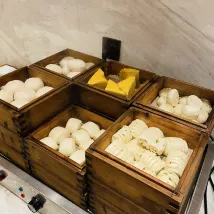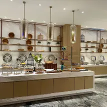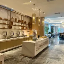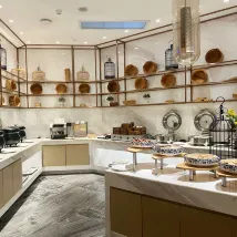 60가지가 넘는 다양한 종류의 조식 뷔페가 눈부시게 펼쳐져 있습니다.