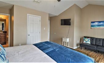 In the 2nd floor master bedroom, there is a new King Zinus 12-inch Green Tea cooling memory foam hybrid mattress, with a beautiful new comforter with new soft sheets to slip into after a fun day in the sun and sand. For the kiddos, we also offer a new pack-n-play (bring your own standard sized sheet), and a nice leather futon (bedding included) for older kids. Kids will love they have their own bed nearby! Very large master bedroom closet to stow away your luggage. The en-suite master bathroom has a full tub/shower, new luxury bath towels, and of course a starter shower pack (soap, shampoo, conditioner, lotion, shower gel). Enjoy morning coffee or evening drinks on the newly painted master balcony!
