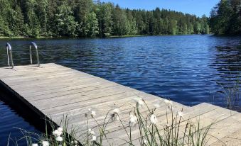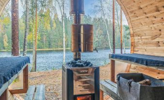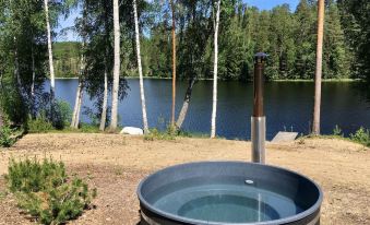 Villa Renkaranta cabin features a spacious, sunny yard and a terrace. The spacious wood-heated panoramic sauna comfortably accommodates larger groups, providing a stunning view of the lake through its panoramic window. The cabin's terrace features a wood-heated hot tub, just a short distance from both the panoramic sauna and the cabin's wood sauna.