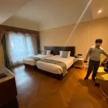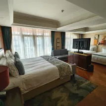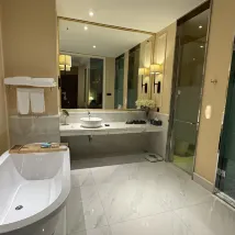 객실에 대해 이야기해 볼까요? 저희는 큰 침대 하나와 작은 침대 하나가 있는 패밀리룸을 예약했습니다. 같은 날 호텔에서 전화해서 제가 세 명이라고 알려줬습니다. 도착하자마자 작은 침대 두 개와 큰 침대 하나가 있는 트리플룸으로 업그레이드해 주었습니다. 정말 세심한 배려였습니다. 한 가지 작은 단점이 있긴 했지만, 크게 문제될 정도는 아니었습니다. 패밀리룸은 2층에 있어서 반 층 올라가거나 엘리베이터를 타고 3층으로 내려간 후 반 층 내려가야 했습니다. 방에 들어가자마자 기분 좋게 놀랐습니다. 객실은 넓고 아름다웠고, 편안하고 고급스러운 느낌이었으며, 지나치게 화려하지는 않았습니다. 특히 욕실은 넓고 밝아서 기분이 정말 좋았습니다. 욕조에는 일회용 욕조 커버와 생강 목욕 소금이 제공되었고, 변기에도 일회용 변기 커버가 있었지만 조금 작았습니다. 변기와 샤워실이 분리되어 있어서 좋았습니다. 드레스룸에는 우산까지 있어서 더욱 좋았습니다.