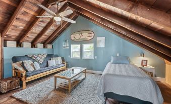 Climb the unique staircase to the upper deck, where you'll find a lofted room featuring a queen futon and twin bed, then go up one more step to another bedroom with a double bed and two more twin beds.