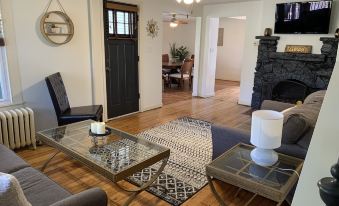 Main floor equipped with a full kitchen with microwave, gas stove/oven, refrigerator, coffee pot, and fully stocked w/ pots, pans, dishes, silverware, cooking utensils, and other kitchen tools. Dining room right of kitchen as well as living space with flat screen Tv and fire stick which you can access your favorite shows. Small work desk also located in space.