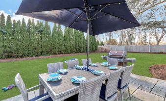 The backyard has a granite patio complete with a comfy sitting area for alfresco coffee and breakfast or afternoon cocktails and a built-in fire-pit. For your BBQ activities there is a new Weber grill and a 8-person patio table for outside dining. There is a large (fenced-in) lawn for running, playing (we have bocce and corn hole) or sunbathing.