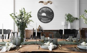 The former woodworking studio has been transformed into a stylish bright and airy Barn for bringing friends and family together. Curl up on the large leather couch beneath 14- foot ceilings in the living area to watch a movie or game on the flat-screen TV and (or) enjoy a lively game of ping-pong in front of the operable glass overhead door leading to the great outdoors. At the other end of the space, before another glass overhead door and with yet another-flat screen TV, is a unique live edge slab wood dining table, cut from a single oak tree, that seats fourteen comfortably. A bar refrigerator, ice maker, and serving table are ready to help with any catering needs. Sliding glass doors lead to an expansive deck and swing overlooking the outdoor fire pit and valley beyond.