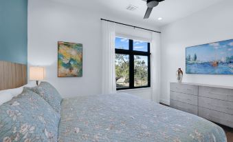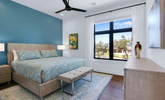 The bedroom is a sanctuary of modern opulence, featuring a king-sized bed with luxurious linens, custom artwork, and thoughtful design touches for a restful night’s sleep. The spacious bathroom boasts custom finishes and a walk-in shower with floor-to-ceiling tile. Step outside onto the balcony to relax in the comfortable lounging area, where you can savor a glass of wine while soaking in the unparalleled Hill Country views.