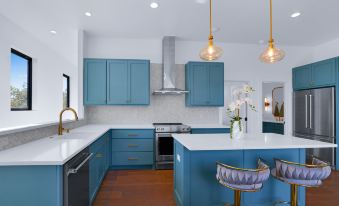 The loft features one beautifully appointed bedroom and one bath, creating an intimate and cozy atmosphere. The open-concept layout allows natural light to fill the space, accentuating the sky-blue cabinetry, marble countertops, and rich leather furnishings. The kitchen, outfitted with high-end built-in appliances, is perfect for culinary adventures for two. After a day of exploring, unwind in the living space by the stunning fireplace for a romantic evening.