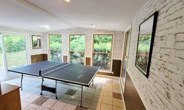The house includes a spacious deck, outdoor firepit, hammock, covered bar area with Roku TV, coal grill, and a picnic table. On the cold nights, enjoy wood fireplace, ping pong, board games, and a dinner at a large dining table.