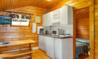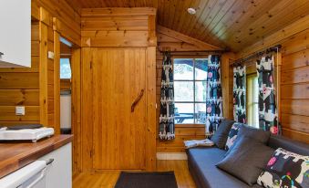 The log cabin, built in 1988, was renovated in 2013 and 2021. It has a living room with a sofa bed for two and a separate sleeping alcove with two beds. The bathroom has a shower and a WC, and there is a covered porch. The kitchen does not have an oven but is equipped with a hot plate, microwave, coffee maker, kettle, toaster, fridge, and tableware.