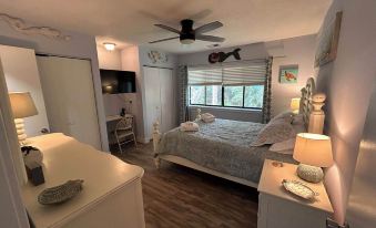 The Master bedroom has a queen-sized bed, ceiling fan, and its own master bath with walk in shower.