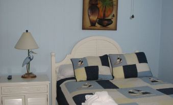 The master bedroom has a queen size bed, ceiling fan and flat screen TV. The adjoining bath has a whirlpool tub to relax in. The view from the window is a lagoon filled with turtles and an occasional alligator, salt marsh and the ocean.