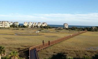 It is an easy 6-8 minute walk across the wide boardwalk that crosses the salt marsh to our private beach. If you don't want to walk, the resort provides golf cart shuttle. At the beach there is a cabana (Coco's On The Beach) that serves food and drinks. Restrooms are also located there so you never have to leave the beach.