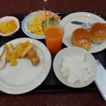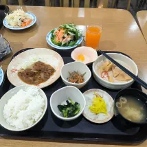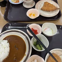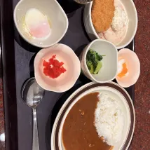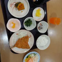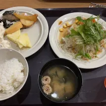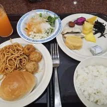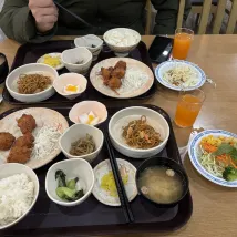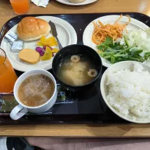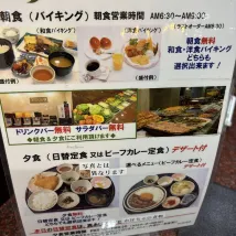 역에서 불과 몇 분 거리에 위치한 아주 가까운 호텔입니다. 무엇보다 가격이 저렴한데다 조식과 석식 두 끼 모두 포함되어 있어서 가성비가 정말 좋았습니다. 식사는 정식 형태로 제공되며, 카레밥 세트와 치킨 가라아게 세트 두 가지 중 선택할 수 있었습니다. 처음에는 예약하기 조금 망설여졌지만, 어차피 하루 숙박이라 한번 이용해 보자고 생각했습니다. 초등학생과 고등학생 단체 손님들이 많이 눈에 띄었습니다.