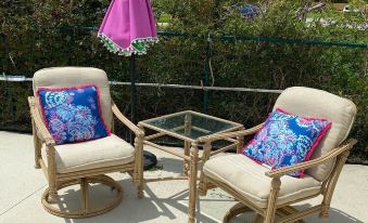 The Hobe Sound Lili Pulitzer inspired cottage was a perfect choice for a recent trip to Florida. My daughter and I were visiting family in Jupiter, FL.I chose a VRBO in Hobe Sound, FL again this year for the close proximity to the beach, quaint shops, a couple of favorite restaurants, easy access to the grocery store and a quiet neighborhood for walks.The host is lovely and was responsive when I inquired about the property. Upon arrival the host showed me around the cottage and I immediately noticed how clean the cottage was. The cottage is tastefully decorated with Lilli Pulitzer decor. Nicely done!The host provided snacks, water and flavored seltzer water which I thought was very thoughtful.The kitchen has a garbage disposal, a dishwasher, stacked washer/dryer, 2 toaster ovens, ample pots, pans, a Keurig coffee maker, coffee pods, a small drip coffee pot, dishes, glassware, cooking utensils, knives and silverware. There are creamers and sugar in the kitchen cabinet. We bought a package of sponges for the kitchen and left unused sponges for the next renters.The property has a pool located just outside the kitchen door. The king bed is comfortable, there are ample dresser drawers to store clothes and a spacious closet with hangers. The bathroom is spacious, has a large glass enclosed shower stall and shower head with strong pressure. The bathroom has towels and toilet paper.The host provides beach chairs, a beach umbrella, beach towels and a cooler bag. TY!