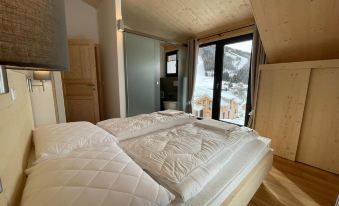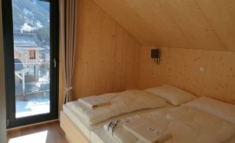 Hohentauern: In the 1st Austrian sports village awaits you cosy holiday village "Almdorf Hohentauern by Alps Resorts", 1'300 m a.s.l.. 300 m from the centre, in a sunny position, 15 km from the lake, 300 m from the skiing area. For shared use: natural state property. In the complex: reception, WiFi, central heating system. In Winter: please take snow chains. Parking at the house, public parking. Grocery 300 m, restaurant 250 m, railway station "Selzthal" 8 km, thermal baths "AQUALUX Fohnsdorf" 36 km, bathing lake "Gaishorn am See" 15 km. Golf course (18 hole) 35 km, ski lift, skisport facilities, slopes 300 m, ski school 1.5 km, cross country ski track 300 m. Nearby attractions: Pfahlbaudorf 1 km, Schaubergwerk Oberzeiring 22 km, Red Bull Ring Spielberg 35 km. Well-known ski regions can easily be reached: Lachtal, Kreischberg. Hiking paths: Gesäuse, Triebener Tauern. Please note: In case of good snow conditions, the house is accessible on skis. "Superior 56 mit IR-Sauna&Sprudelbad", 5-room chalet 120 m2 on 2 levels. Spacious and bright, comfortable and tasteful furnishings: entrance hall. Living/dining room with dining table, satellite TV, flat screen and gas heater. 3 double bedrooms. Open kitchen (oven, dishwasher, 4 ceramic glass hob hotplates, microwave, electric coffee machine). Bath/shower, shower/WC. Terrace. Terrace furniture. Very beautiful view of the mountains and the countryside. Facilities: Internet (WiFi, free). Parking at the house. Please note: non-smoking house. Smoke alarm.
