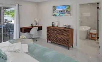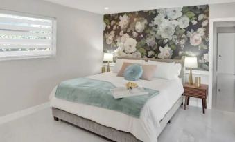Tropical design with a beautiful floral master bedroom. Private luxurious bath includes freestanding bathtub, robes, high pressure spa like showers. Escape to the Jungle or join the captain at sea. This home was designed to bring your vacation to the next level!