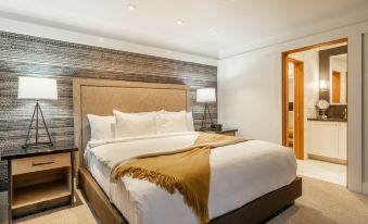 The primary suite offers a king-sized bed. Eclectically styled in an alpine-mod style with tiled floors and a patterned accent wall, the bedroom also features a luxurious en-suite bathroom with a deep tub shower. A separate powder room adds convenience, while a private washer and dryer allow you to pack light, no matter how long you stay.