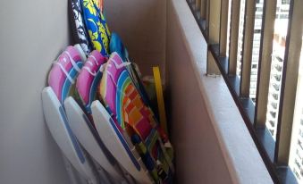 FTo keep the kids occupied the 7th floor also offers ping pong. Both charcoal and gas BBQ’s are available.  A large covered paved stone open air lanai is available for your enjoyment.  Just in case you need to wash a few clothes the 7th floor coin operated laundry has more than 20 washing and drying machines.  In building reserved parking is included at no extra charge. NOTE:  Diamond Head portion of deck closed for remodeling.