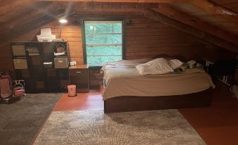Hang from a Hammock in the trees, splash in the creek, take a walk into town.About pets:Pets allowed: dogs (limit 2 total).About checkOut:Check out before 11:00 AM.About children:Children allowed: ages 0-17.About customRules:Do not wander off the clearing the cabin sits on. There are neighbors but they are far away..The Shed in back, and the other structure next to it are off limits.