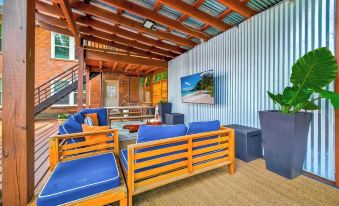 Outdoor Living Space: Enjoy the covered outdoor area, equipped for entertainment or relaxation with patio furniture, a picnic bench, and a ping pong table, all under atmospheric hanging lights.