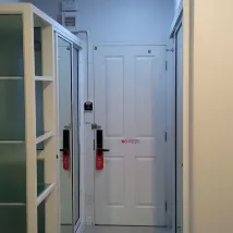 방에는 전자레인지와 아주 큰 냉장고가 있었습니다.