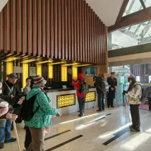 황산이 워낙 넓어서 산 위에서 하룻밤 묵는 건 필수예요. 아니면 다 둘러볼 수가 없어요. 광명정에서 아주 가까운 바이윈 호텔에 묵었는데, 에코 통나무집이었어요. 일반 객실 형태는 아니어서 천장이 비스듬했지만, 필요한 건 다 있었어요. 난방도 되고, 여름에는 작은 에어컨과 선풍기도 있었고, 화장실에는 스마트 변기가 설치되어 있었어요. 피로를 풀 수 있는 족욕기도 비치되어 있었고, 옷장에는 패딩 점퍼도 있어서 새벽에 나가도 춥지 않았어요. 전담 버틀러 서비스도 있어서 애프터눈 티와 간식도 주고, 저녁에는 과일도 가져다주고, 다음 날에는 커피와 체크아웃 시 추가 생수까지 챙겨줬어요. 정말 세심하더라고요. 호텔 식사는 뷔페식이었는데, 괜찮았어요. 산 위 식당치고는 종류도 다양했고요. 호텔 밖에는 푸드코트가 있고, 인기 있는 꼬마 열차의 상행선인 톈하이 역과 가까워서 남쪽, 북쪽, 서해 대협곡으로 이동하기도 편리했어요.